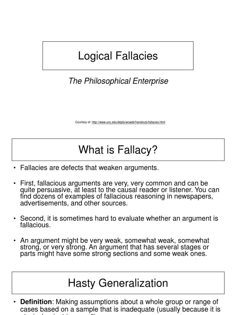 Fallacies What this handout is about This handout discusses common logical fallacies that you may encounter in your own writing or the writing of others. The cats scratch therefore caused the fever. Fallacies often seem superficially sound and far too often have immense persuasive power even after being clearly exposed as false.